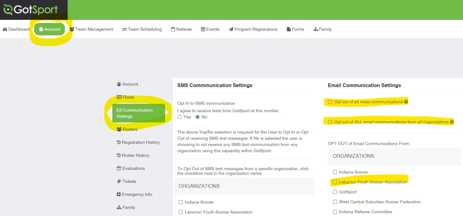 Please make sure you have NOT opted out of receiving emails from LYSA. On your GotSport Account you should see “Communication Preferences” and make sure you did not Opt-Out of mass email communication. 100% of the emails from LYSA Administration will come through GotSport and you will miss out on important information.