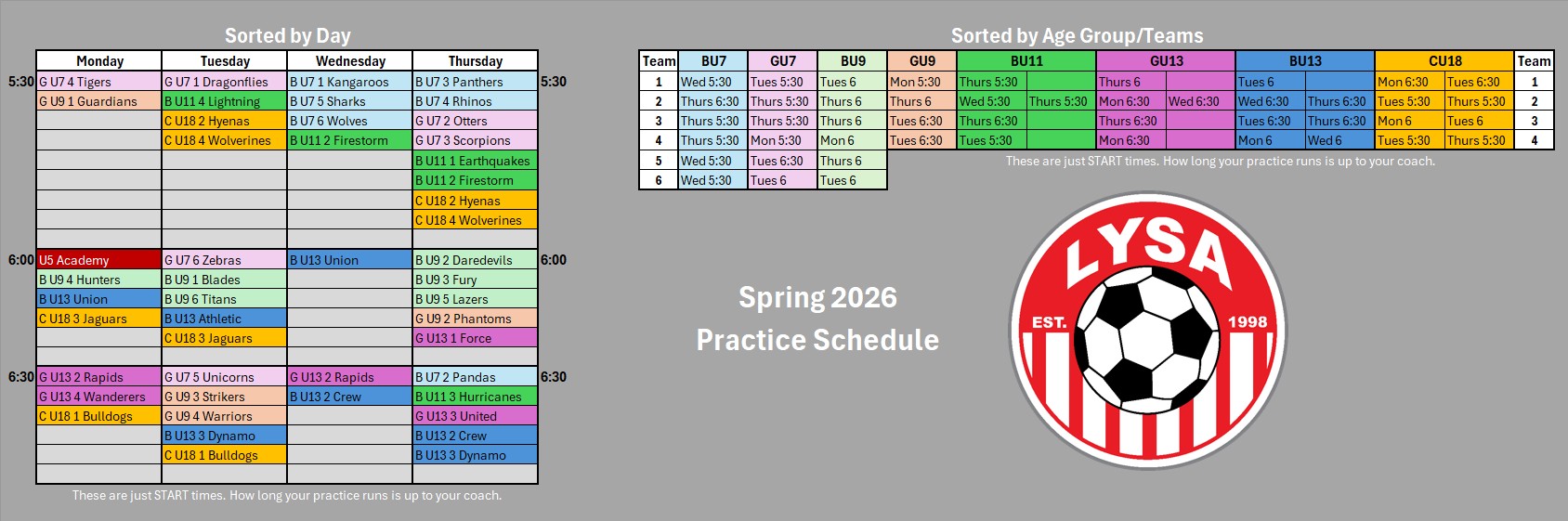 Parents, if the schedule and what your coach has told you are different, go with what your coach told you. This is just a resource.